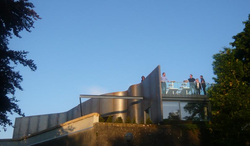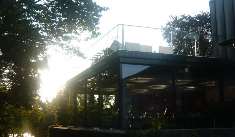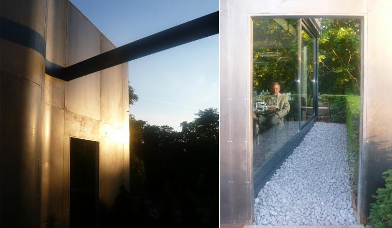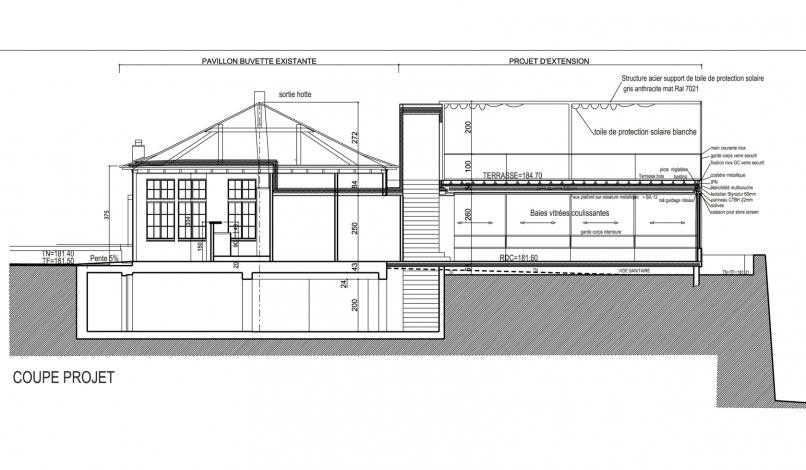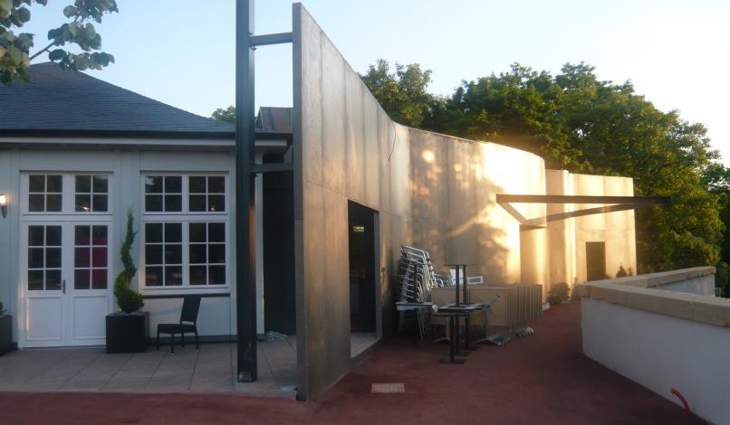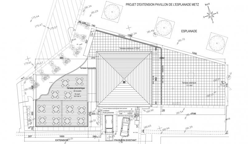 Le projet consiste en la rénovation du pavillon buvette de l’Esplanade, en secteur classé Monument Historique, et création d’une extension bar-restaurant permanent d’une cinquantaine de couverts. L’ancien pavillon est entièrement rénové, au plus proche de son état d’origine, en accord avec l’Architecte des Bâtiments de France, et l’extension, en opposition par son architecture contemporaine de métal et de verre, se juxtapose en reprenant la forme carrée du bâti ancien. Le carré de l’extension est interrompu par un voile ondulant en acier Corten, élément signalétique du projet, accompagnant le promeneur jusqu’au belvédère sur le plan d’eau de Metz.