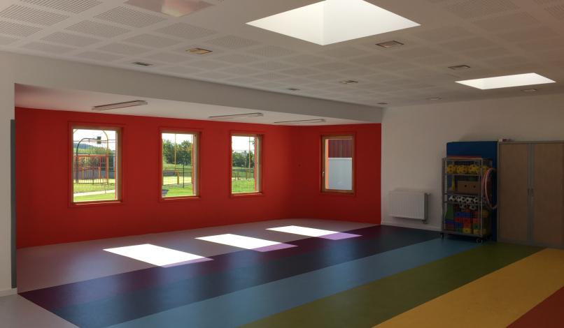 Le projet se présente comme un bâtiment de plein pied en forme de L «chahuté» par des boites ludiques de tailles et de couleurs différentes. Ce parti architectural a pour but de permettre une bonne lisibilité des espaces pour les enfants : différencier les espaces de travail ou de repas, où l’enfant doit être plus posé et concentré, et les espaces ludiques ou culturels, communs aux deux structures. Le projet est orienté de façon à ce que les espaces soient majoritairement éclairés à l’Ouest ou à l’est. Le projet du groupe scolaire répond à un certain nombre d’objectifs environnementaux prioritaires définis par la Commune de Beyren-les-Sierck. De plus, le projet intègre la nouvelle réglementation RT 2012.